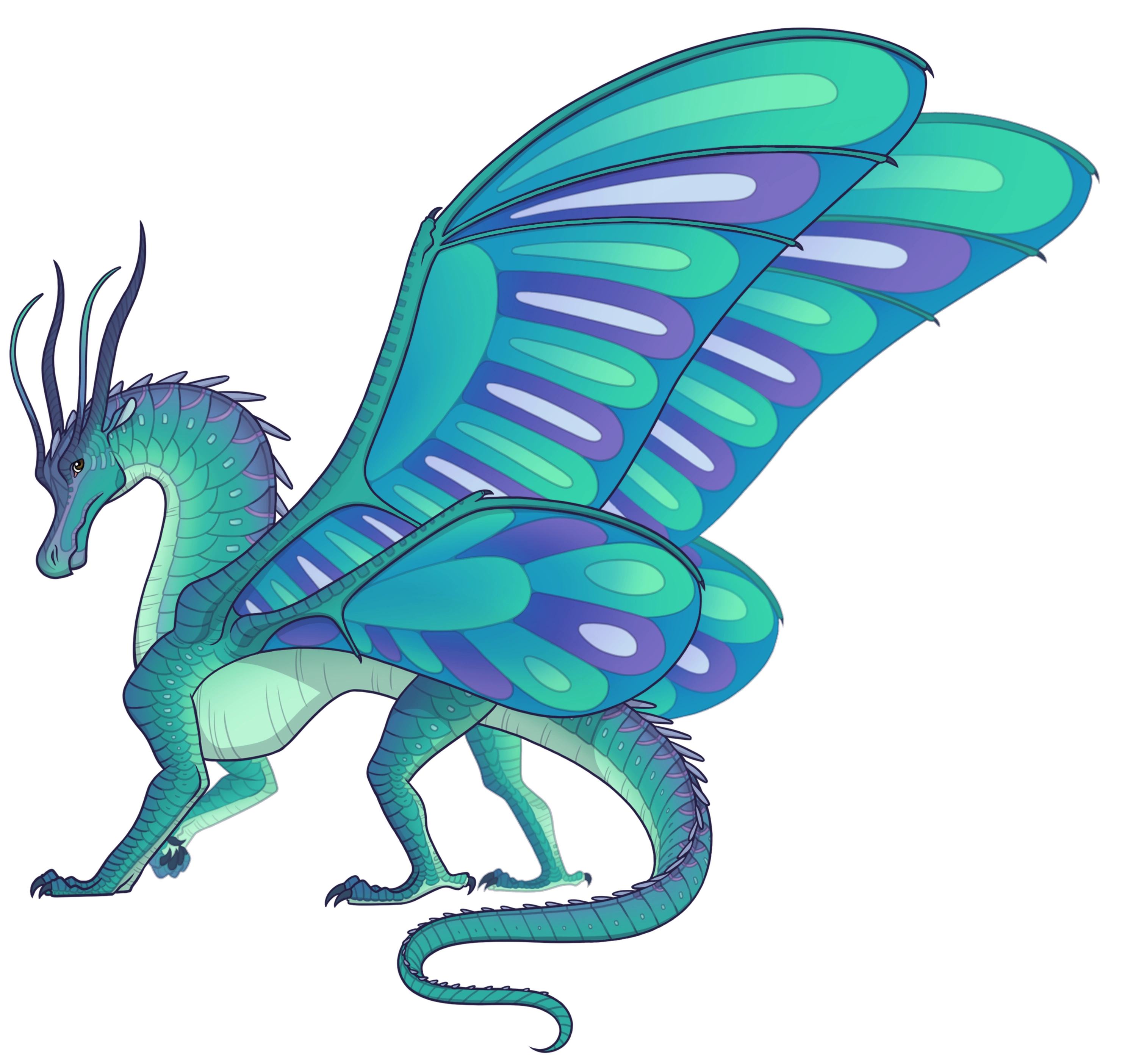 Amiral a des écailles d'un bleu-vert irisé, comme un mélange des écailles de ses enfants[1] et il est assez maigre.[2] Il a des rayures violettes sur ses ailes, avec des taches blanches symétriques.[1] Il a des yeux marron aux reflets dorés.[1]