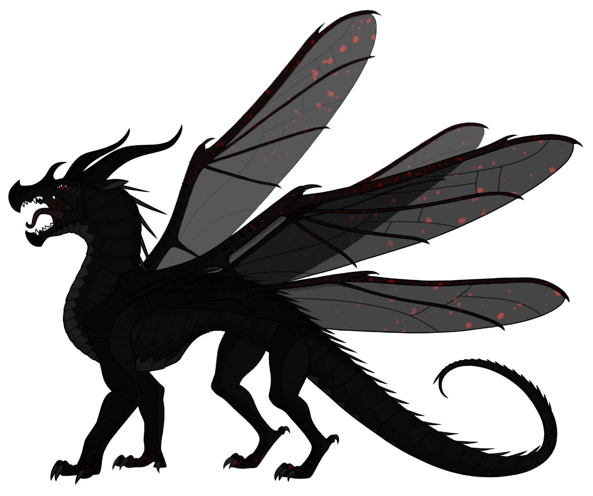 Bombardier a des écailles d'un noir d'encre avec des tâches rouges sur ses pattes, ses ailes[1] et ses oreilles.
